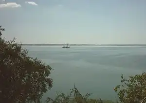 The Achterwasser (Low German achtern = "rear, behind") is a lagoon forming a bay on the Peenestrom river, which flows into the Baltic Sea. This lagoon extends so far into the island of Usedom, that it is only separated from the Baltic Sea by a narrow barrier spit between Ückeritz and Zinnowitz. It is bordered to the north by the peninsula of Gnitz and to the south by the Lieper Winkel. The reed-lined south-eastern bay is called the Balmer See, and the one to the southwest, which can only be accessed with difficulty on its western shore, is the Krienker See.