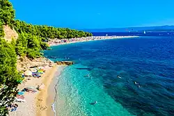 The Adriatic Sea's average depth is 259.5 metres (851 ft), and its maximum depth is 1,233 metres (4,045 ft); however, the North Adriatic basin rarely exceeds a depth of 100 metres (330 ft).[19] The North Adriatic basin, extending between Venice and Trieste towards a line connecting Ancona and Zadar, is only 15 metres (49 ft) deep at its northwestern end; it gradually deepens towards the southeast. It is the largest Mediterranean shelf and is simultaneously a dilution basin and a site of bottom water formation.[31] The Middle Adriatic basin is south of the Ancona–Zadar line, with the 270-metre (890 ft) deep Middle Adriatic Pit (also called the Pomo Depression or the Jabuka Pit). The 170-metre (560 ft) deep Palagruža Sill is south of the Middle Adriatic Pit, separating it from the 1,200-metre (3,900 ft) deep South Adriatic Pit and the Middle Adriatic basin from the South Adriatic Basin. Further on to the south, the sea floor rises to 780 metres (2,560 ft) to form the Otranto Sill at the boundary to the Ionian Sea. The South Adriatic Basin is similar in many respects to the Northern Ionian Sea, to which it is connected.[14] Transversely, the Adriatic Sea is also asymmetric: the Apennine peninsular coast is relatively smooth with very few islands and the Mount Conero and Gargano promontories as the only significant protrusions into the sea; in contrast, the Balkan peninsular coast is rugged with numerous islands, especially in Croatia. The coast's ruggedness is exacerbated by the Dinaric Alps' proximity to the coast, in contrast to the opposite (Italian) coast where the Apennine Mountains are further away from the shoreline.[32]