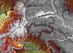 The Afghanistan–China border is a 92-kilometre-long (57 mi)[1] boundary between Afghanistan and China, beginning at the tripoint of both countries with the Pakistan's federally administered territory of Gilgit-Baltistan, following the watershed along the Mustagh Range, and ending at the tripoint with Tajikistan. This short border is in the far northeast of Afghanistan, distant from much of the country or urban areas in either country, at the end of the long, narrow Wakhan Corridor. The Chinese side of the border is in the Chalachigu Valley. The border is crossed by several mountain passes, including Wakhjir Pass in the south and Tegermansu Pass in the north.