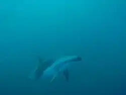 A vulnerable population of fish-eating killer whales are present offshore on the Agulhas Bank. Observations peak in January while few are sighted in April and May. The killer whales move in pods of 1-4 individuals and are mostly sited over the shelf edge off the south-east coast.[54] An analysis of killer whale mtDNA has shown that there was a peak inter-oceanic migration events during the Eemian interglacial period, 131-114 kya. This peak coincides with a period of maximal Agulhas leakage which promoted a rapid and episodic interchange of killer whale lineages. During this period killer whales and other marine top predators, such as the great white shark, colonised the North Atlantic and Mediterranean by following their prey — bluefin tuna and swordfish.[55]