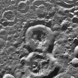 Aladdin is a crater in the northern hemisphere of Saturn's moon Enceladus. Aladdin was first discovered in Voyager 2 images. It is located at 60.7° North Latitude, 26.7° West Longitude and is 37.4 kilometers across.[1] It is located near the craters Ali Baba and Samad.[2] Aladdin has a large dome in its interior, suggesting the crater has undergone some viscous relaxation.