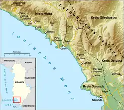 The Albanian Ionian Sea Coast (Albanian pronunciation: [brɛˈɡdɛ:ti jˈɔn] — Albanian: Bregdeti Jon) is a coastline of the north-eastern Ionian Sea, that encompasses the south-western border of the Republic of Albania, stretching from the southern half of Karaburun Peninsula, across the historical region of Labëria, the city of Sarandë, the mountains of the Ceraunians, and the Albanian Riviera, to the Lake of Butrint, where the Strait of Corfu separates the country from Greece.