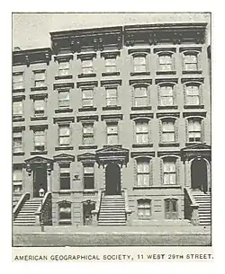 The headquarters of the American Geographical Society were initially established at New York University in Washington Square. The university's chapel was used for some of the society's lectures and the AGS remained at this location until 1858. Later, two rooms located in Clinton Hall, formerly the Astor Opera House, became the society's next home in December 1858.[7] In 1866, the American Geographical Society moved to Cooper Union at Cooper Square on Ninth Street, where it remained for ten years.[8] In 1911, the AGS moved to 3755 Broadway at 156th Street.[9] This three story building was built on land donated by Archer Milton Huntington's mother and designed by Charles Pratt Huntington.[10] Audubon Terrace became the society's most prominent home and was visited by many scholars and dignitaries, including President Woodrow Wilson.