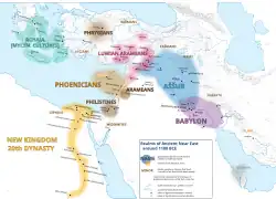 The states of the Neo-Hittite kingdoms were Luwian, Aramaic and Phoenician-speaking political entities of Iron Age northern Syria and southern Anatolia that arose following the collapse of the Hittite Empire around 1180 BC and lasted until roughly 700 BC. The term "Neo-Hittite" is sometimes reserved specifically for the Luwian-speaking principalities like Melid (Malatya) and Karkamish (Carchemish), although in a wider sense the broader cultural term "Syro-Hittite" is now applied to all the entities that arose in south-central Anatolia following the Hittite collapse – such as Tabal and Quwê – as well as those of northern and coastal Syria.[24][25]