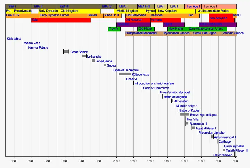 Early Bronze Age I 3300–3000 BC Jemdet Nasr period in Mesopotamia, Protodynastic to Early Dynastic Period of Egypt, settlement of Phoenicians