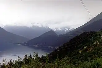 The region comprises a mix of volcanic and sedimentary rocks.[6] At the end of the Last Glacial Period (LGP), Seton and Anderson were a single continuous lake, with a level about 100 metres (330 ft) higher than present. At the Seton Portage area, erosion and landslides of weak rocks susceptible to rapid weathering tumbled into the lake, and tributaries deposited sediment. Over tens of thousands of years, the accumulation created separate lakes, and a river formed from Anderson to Seton,[9] which by 1910 was about 18 metres (60 ft) lower[10] (currently 15 metres (50 ft)).[11] Minimal agricultural land exists along the mountainous shores of the lake beyond a limited area at the portage.[12] Here, a noticeable gap in the mountains indicates a large landslide on the east side.[7]