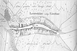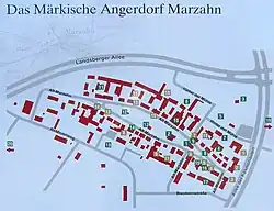 An Angerdorf (plural: Angerdörfer) is a type of village that is characterised by the houses and farmsteads being laid out around a central grassed area, the anger (from the Old High German angar =pasture or grassy place),[1] a village green which was common land, owned jointly by the village community. The anger is usually in the shape of a lens or an eye, but may also take other forms: a rectangle, triangle, circle or semi-circle (illustrated). The buildings are oriented with their eaves facing the road. Livestock stalls and barns are at the rear of the plot (in Austria called the Hintaus) and may be linked by a farm track that runs around the village forming an outer ring.