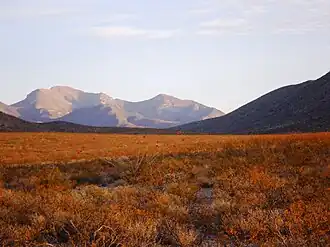 Physiographically, the range divides into two parts. The compact southern part, which includes Animas Peak, is higher and wider, rising up to 4,000 ft (1,200 m) above the nearby valleys. It has a sky island character, with dense coniferous forests at the higher elevations.[3] The longer, narrow northern portion is lower, reaching only 7,310 ft (2,230 m) at Gillespie Peak, and is characterized by grassland and piñon-juniper woods and shrubs.[3] The Animas Mountains lie near the Chihuahuan Desert, the Sonoran Desert, the Sierra Madre Occidental of Mexico, and the mountains surrounding the headwaters of the Gila River. Biotic influences from these regions, as well as the more distant Rocky Mountains, give the southern portion of the range a great diversity of species, including "approximately 130 species of birds, 60 species of mammals, and 40 species of reptiles."