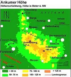 The highest elevations in the Ankum Heights are the Trillenberg, which is 140 metres (460 ft) high and is located in the southeastern part, and the Queckenberg, which has a 140 metres (460 ft) northwestern summit and a 137 metres (449 ft) southeastern peak and lies in the centre of the range.