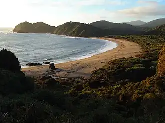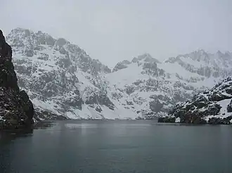 According to La Roché's account of the events reportedly published in French in London in 1678[12] and its surviving 1690 Spanish précis by the mariner, cosmographer and writer Capt. Francisco de Seixas y Lovera[13][14][15] (translated into English by Alexander Dalrymple, the first Hydrographer of the British Admiralty), "they found a Bay, in which they anchored close to a Point or Cape which stretches out to the Southeast with 28. 30. and 40. fathoms sand and rock."[12][5][16] The surrounding glaciated, mountainous terrain was described as "some Snow Mountains near the Coast, with much bad Weather."