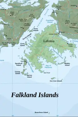 Royal Navy officer and author James Burney conjectured that La Roché might have visited not South Georgia but the Falkland Islands instead (known at that time as John Davis's South Land or Sebald Islands, not yet Malouines, Falklands or Malvinas), possibly anchored in the Bay of Harbours or Eagle Passage area, and upon his departure sailed east with the flat, boggy Lafonia Peninsula on his port and Beauchene Island on his starboard.[6]