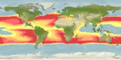 AquaMaps is a collaborative project with the aim of producing computer-generated (and ultimately, expert reviewed) predicted global distribution maps for marine species on a 0.5 × 0.5 degree grid of the oceans based on data available through online species databases such as FishBase and SeaLifeBase and species occurrence records from OBIS or GBIF and using an environmental envelope model (see niche modelling) in conjunction with expert input.[1][2] The underlying model represents a modified version of the relative environmental suitability (RES) model developed by Kristin Kaschner to generate global predictions of marine mammal occurrences.[3]