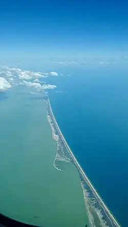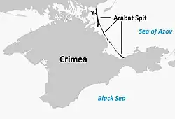 The Arabat Spit (Ukrainian: Арабатська коса; Russian: Арабатская коса; Crimean Tatar: Arabat beli) or Arabat Arrow is a barrier spit that separates the large, shallow, salty Syvash lagoons from the Sea of Azov. The spit runs between the Henichesk Strait in the north and the north-eastern shores of Crimea in the south.[3] It is the largest of several spits of the Sea of Azov.