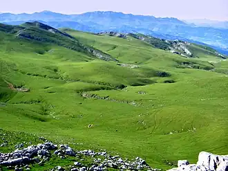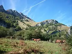 Between May and November, livestock, especially latxa sheep which provide the milk for Idiazabal cheese, dairy cattle and a herd of wild horses, graze in the park's public pastures.[10][11] Although the ranges are generally uninhabited, some people of Aralar follow a nomadic life, tending their animals. Through the summer months, the sheep graze in the higher terrain. Pastoral huts have been built in these areas for shepherds. The animals winter near the villages.
