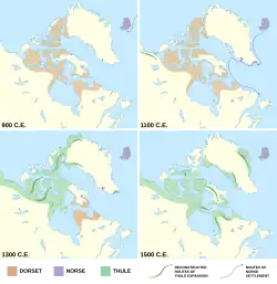The Dorset / Thule culture transition dates around the ninth–10th centuries CE. Scientists theorize that there may have been cross-contact between the two cultures with the sharing of technology, such as fashioning harpoon heads, or the Thule may have found Dorset remnants and adapted their ways with the predecessor culture.[22] The evidence suggested that Inuit descend from the Birnirk of Siberia, through the Thule culture expanded into northern Canada and Greenland, where they genetically and culturally completely replaced the Indigenous Dorset people sometime after 1300 CE.[23] The question of why the Dorset disappeared so completely has led some to suggest that Thule invaders wiped out the Dorset people in "an example of prehistoric genocide."[24]