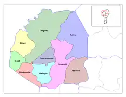 The department of Atakora was bifurcated in 1999, when its southern territory was transferred to the newly created Donga Department. The capital of the department is Natitingou.[9] Atakora is subdivided into nine communes, each centred at one of the principal towns: Boukoumbé, Cobly, Kérou, Kouandé, Matéri, Natitingou, Pehonko, Tanguiéta and Toucountouna.[9]