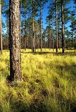 The Eastern woodlands are the original, predominant ecosystem of the Atlantic coastal plain. The Atlantic coastal plain upland longleaf pine woodland is an endemic plant community found in most of the Atlantic coastal plain, ranging from Virginia to northern Florida. These woodland savannas are reliant on sandy soils and are fire dependent, lest hardwoods start to dominate. Alongside longleaf pine, typically associated flora includes turkey oak and wiregrass. The Florida longleaf pine sandhill extends the longleaf pine forests into central Florida, with South Florida slash pine flatwoods, Florida sand pine scrub and Florida dry prairie stretching into southern Florida.[11][12][13][14][15] Longleaf pine woodlands also stretch further west, to eastern Texas. These consist of East Gulf and West Gulf longleaf pine flatwoods, bisected by the Mississippi Alluvial Plain.[12][13][16]