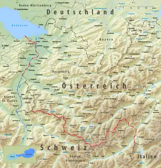 The border between the modern states of Austria and Switzerland is divided into two parts, separated by the Principality of Liechtenstein, with a total length of 180 km (110 mi).[1] The longer, southern stretch runs across the Grison Alps and the shorter one following mostly the Alpine Rhine (which was straightened), except near Diepoldsau and between Lustenau and Lake Constance, where it follows the Old Rhine bed. The border continues northward to the Austrian-Swiss-German tripoint located within Upper Lake Constance.