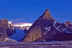 The highest point is Mount Odin at 2,147 m (7,044 ft)[3][4] while Mount Asgard (Sivanitirutinguak) at 2,015 m (6,611 ft) is perhaps the best known.[5] The highest point in the northern Baffin Mountains is Qiajivik Mountain at 1,963 m (6,440 ft).[6] There are no trees in the Baffin Mountains because they are north of the Arctic tree line. Rocks that compose the Baffin Mountains are primarily deeply dissected granitic rocks. They were covered with ice until about 1500 years ago, and vast parts of them are still ice-covered. Geologically, the Baffin Mountains form the eastern edge of the Canadian Shield, which covers much of Canada's landscape.