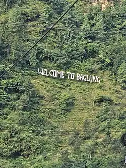 Baglung is a municipality in Gandaki Province, in western Nepal, 275 km (171 mi) west of Kathmandu. It is the administrative headquarters of Baglung District. Baglung serves as the major center for business, finance, education, service and healthcare for the people of mid-Kali Gandaki valley that encompass Beni, Jaljala, Baglung, Kushma, Kathekhola, Galkot, Phalewas and Jaimuni local bodies. The city is located at the cross-section of Kaligandaki corridor highway and midhill highway that transverse Nepal in north–south and east–west directions respectively.