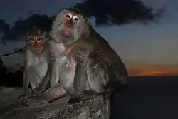 Squirrels are quite commonly encountered, less often is the Asian palm civet, which is also kept in coffee farms to produce kopi luwak. Bats are well represented, perhaps the most famous place to encounter them remaining is the Goa Lawah (Temple of the Bats) where they are worshipped by the locals and also constitute a tourist attraction. They also occur in other cave temples, for instance at Gangga Beach. Two species of monkey occur. The crab-eating macaque, known locally as "kera", is quite common around human settlements and temples, where it becomes accustomed to being fed by humans, particularly in any of the three "monkey forest" temples, such as the popular one in the Ubud area. They are also quite often kept as pets by locals. The second monkey, endemic to Java and some surrounding islands such as Bali, is far rarer and more elusive and is the Javan langur, locally known as "lutung". They occur in a few places apart from the West Bali National Park. They are born an orange colour, though they would have already changed to a more blackish colouration by their first year.[55] In Java, however, there is more of a tendency for this species to retain its juvenile orange colour into adulthood, and a mixture of black and orange monkeys can be seen together as a family. Other rarer mammals include the Sunda leopard cat, Sunda pangolin and black giant squirrel. Snakes include the king cobra and reticulated python. The water monitor can grow to at least 1.5 m (4.9 ft) in length and 50 kg (110 lb)[56] and can move quickly.