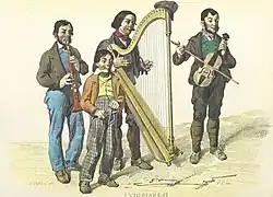 Although Basilicata hosted classical composers such as Carlo Gesualdo and Egidio Romualdo Duni, the region is primarily identified in popular music, which reflects the humble living conditions of its inhabitants. The arpa viggianese (commonly known as arpicedda) is a typical harp from Viggiano of average size, with a thin and light structure that makes it easier to carry; it was the distinctive instrument of street musicians from the Val d'Agri area in the past centuries, who wandered around the world and many of whom were admitted to symphony orchestras. Today, Viggiano is remembered as the "City of Harp and Music".[43] Other traditional instruments are cupa cupa, zampogna and ciaramella.