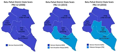 Due to electoral division by Election Commission of Malaysia, there are three parliamentary and state constituencies (DUN) dividing Batu Pahat town. There are (P147) Parit Sulong parliamentary seat, (N17) Semerah state seat; (P149) Parliament Sri Gading parliamentary seat, (N21) Parit Yanni state seat and (P150) Batu Pahat parliamentary seat, (N23) Penggaram state seat. (Election Results of the 13th Malaysian General Elections) The last election results listed as below: