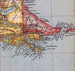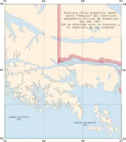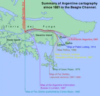 - ↑ Andrea Wagner: Der argentinisch-chilenische Konflikt um den Beagle-Kanal. Ein Beitrag zu den Methoden friedlicher Streiterledigung. Verlag Peter Lang, Frankfurt a.M. 1992, ISBN 3-631-43590-8, German Language, p. 106 :«Resumé:Es existierten verschiedene argentinische Karten, die die Rechtauffassung Chiles widerspiegelten, v.a. in der Zeit unmittelbar nach dem Abschluß des Grenzvertrages von 1881. Das chilenische Kartenmaterial war dagegen stets einheitlich geblieben, und hat nur die chilenische Auffassung wiedergegeben.»