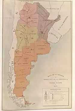 This reproduction of the "Map of the division of the Argentine territory into Military regions 1905" was included in the Military Bulletin of the Argentine Ministry of War, Year IV, vol. I, 1 May 1905, No. 140. The Argentine military regions are distinguished by different colours, all territories located south of the Beagle Channel as far as Cape Horn have been omitted and thus understood to be under Chilean sovereignty.
