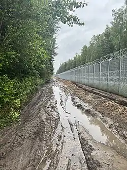 Lithuania decided to build a border barrier to stem the flow of illegal crossings.[12] On 5 August 2021, the chief of the Lithuanian State Border Guard Service presented a project of the proposed barrier for the entire Belarus-Lithuania border which would be 4 m (13 ft) high and would use multiple layers of the Concertina wire.[13] The cost of the project was estimated at €150 million and the Lithuanian parliament approved it as a matter of urgency. Lithuania completed the 502 km (312 mi) barrier in August 2022 and the modern surveillance equipment was installed by the end of the year.[14] In March 2023, the Lithuanian authorities announced that 100% of the border is surveilled.[15]
