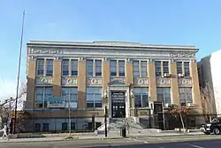 The section retains much of the character that at one time made it the premiere 20th century residential district of the city.[8][9] A variety of architectural styles can be found along the Boulevard, Bergen Avenue, and sidestreets including 19th-century rowhouses, Victorian and Edwardian mansions. Many of the multi-family buildings are pre-war, built during the period of expansive growth in the 1920s and 1930s, sometimes Art Deco style.[10] including The Hague, residence of one of the city's best-known mayor, Frank Hague.[11] Among the many landmarks in the area are the Fairmount Apartments,[12] Temple Beth-El, and the former Jersey City YMCA. Lincoln the Mystic, a statue of a seated Abraham Lincoln by James Earle Fraser is situated at the entrance to the park which bears the president's name.[13] and is one of the Hudson County's largest public green spaces.[14][15]
