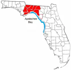 The Big Bend region is located at the northern end of Apalachee Bay along the broad arc of land where the predominantly east–west coastline of the Florida Panhandle connects to the predominantly north–south geography of the Florida Peninsula. It stretches eastward from the Forgotten Coast past the delta of the Suwannee River, with some definitions extending the southwestern end as far as the edge of the Tampa Bay area. Inland areas are often covered with woodlands and marshes around the southward- and southwestward-trending rivers draining towards the Gulf of Mexico. The Big Bend region includes the area between the Apalachicola and Suwannee Rivers historically called Middle Florida.[3][4] North Florida's portion of the Red Hills Region is located within the Big Bend region. The Big Bend Coast either contains[5] or is coterminous with[6] the Nature Coast.