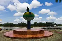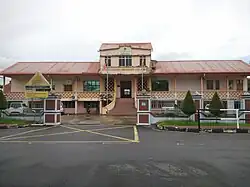 Meradong District was initially named as Binatang district and the town as Binatang town. In Malay language, Binatang literally translated as "animal". It was said that this area was once a fertile land with various wild fruits; attracting animals to gather here and search for food. Therefore, the early settlers named it Binatang. According to Ptolemy's Geography book written circa 150 AD, a location at the northwest tip of Borneo was described as Theriodes which means "animal" in Greek which tallies with Sanskrit "Tiryagja" and Malay "Binatang", presently still the name of a town near the mouth of the Rejang River.[2] However, the local people later felt that the name was indecent and it was changed to Bintang (meaning "stars" in Malay). After a few years, the local authorities decided that the place name should not be changed so easily; and they reverted the name back to Binatang.[1][note 2] Finally, in 1984,[3] after a discussion with district council members, Sarawak chief minister Abdul Taib Mahmud decided to change "Binatang" district into "Meradong" district and the town name to "Bintangor".[1][note 3] The name Meradong is derived from the river of the same name, which passes through the town before merging into the larger Rajang River. The name Bintangor is derived from the name of a tree which is found on the hills.[3] The Calanolide A compound extracted from the Bintangor tree (Calophyllum lanigerum) is believed to be a vital component to treat HIV infection.[4]