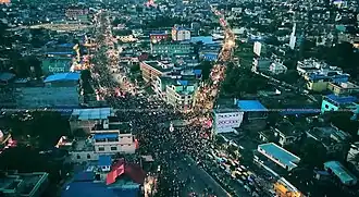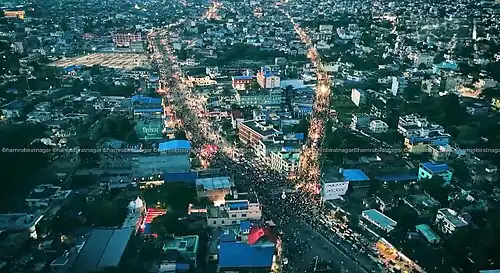 Biratnagar (Nepali: विराटनगर) is a metropolitan city in Nepal, which serves as the capital of Koshi Province.[8][9][10] With a Metropolitan Urban Agglomeration population of 244,750 as per the 2021 census,[11] it is the largest city and fastest growing city in the province and also the headquarters of Morang district.[12] As per the preliminary report of 2022 Nepal census, Biratnagar Metropolitan has an estimated city population of 243,927 excluding the suburban areas which are now very well connected to the old town. It is the administrative center of the Greater Birat Development Area which incorporates the cities of Biratnagar and its suburbs and towns of-Itahari-Gothgau-Biratchowk-Dharan[13] primarily located on the Koshi Highway in Eastern Nepal, with an estimated total urban agglomerated population of 804,300 people in 159,332 households including the town of Ithari.[14] Biratnagar is located 399 km (248 mi) east of the capital, Kathmandu, and 6 km (3.7 mi) north of the bordering town of Jogbani in the Indian state of Bihar which is very well connected through Rani Path (Old Highway) and Koshi Path (New Highway). It is one of the major entry point in Nepal for Businessmen as well as Tourists who come to visit Nepal for various purposes. A customs duty is required to be paid for Indian vehicles in Nepal and vice versa.
