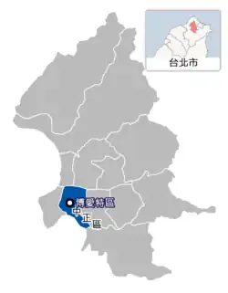 The Bo'ai Special Zone is a restricted zone in Zhongzheng District, Taipei, Taiwan, for the protection of the Presidential Office Building. It is in the historic center of Taipei and includes other government office buildings and historic sites.[1][2]