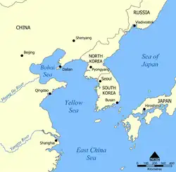 The Bohai Sea is enclosed by three provinces and one direct-administered municipality from three different regions of China—Liaoning Province (of Northeast China), Hebei Province and Tianjin Municipality (of North China), and Shandong Province (of East China). It is the center of the Bohai Economic Rim, and its proximity to the Chinese capital of Beijing and the municipality of Tianjin makes it one of the busiest seaways in the world. The entrance to the Bohai Sea is considered a part of the territorial sea of the People's Republic of China due to the presence of the Miaodao islands.[3][4] China declared the Bohai sea to be part of its inland waters in 1958.[5]