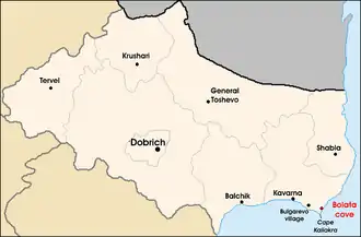 Bolata cove is located at the northern rocky coastline of the Bulgarian seaside. It is 3 km to the north of the Kaliakra headland. The nearest settlements are Bulgarevo village in about 5 km distance and the town of Kavarna in 13 km to the west.[2]