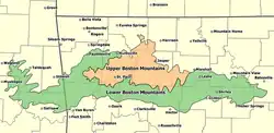The Boston Mountains is a Level III ecoregion designated by the Environmental Protection Agency (EPA) in the U.S. states of Arkansas and Oklahoma. Part of the Ozarks, the Boston Mountains are a deeply dissected plateau. The ecoregion is steeper than the adjacent Springfield Plateau to the north, and bordered on the south by the Arkansas Valley. The Oklahoma portion of the range is locally referred to as the Cookson Hills. There are several theories of how the mountains were named, though apparently none are related to the Massachusetts city.[1]