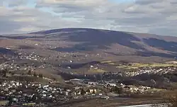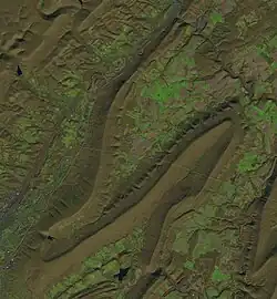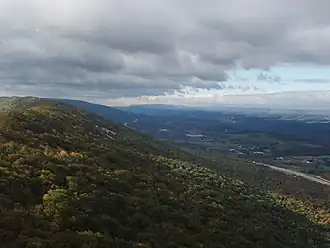 ![]() The higher southwest section of Brush Mountain looking southwest toward Altoona. Interstate 99 is lower right. The Allegheny Front is center right, with Blue Knob in the center. | |