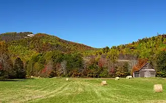 The Brushy Mountains divide, for much of their courses, the waters of the Yadkin River and the Catawba River, two of central North Carolina's largest rivers. The range is approximately 45 miles (72 km) long, but only 4 to 8 miles wide. The highest point in the chain is Pores Knob (2,680 feet, 820 meters), in Wilkes County.[1] Among the other notable peaks in the range are Hibriten Mountain in Caldwell County, which marks the western end of the Brushy Mountains and is a prominent landmark in the city of Lenoir, North Carolina; Hickory Knob, the highest point in Alexander County, North Carolina; and Fox Mountain, the highest point in Iredell County, North Carolina. The "Brushies", as they are often called by locals, usually rise from 300 to 800 feet (240 m) above the surrounding countryside, with few peaks rising more than a thousand feet above their base.[1] The forests on the mountains are part of the Southeastern mixed forests ecoregion.[2]