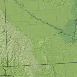 Buffalo Ridge is part of the inner coteau and is the highest point of the Coteau des Prairies in Minnesota.[3] Its bedrock is formed of Cretaceous shale, sandstone and clay that lie above the pinkish-red Upper Precambrian Sioux Quartzite.[4] These units are covered in most areas by thick deposits of glacial drift, which consist of up to 800 feet (244 m) of pre-Wisconsin age glacial till (generally considered Kansas drift) left after the glaciers receded. The inner coteau is made up of extremely stream-eroded glacial deposits of pre-Wisconsin glacial drift, which is then covered by a 6 to 15 foot (1.8 to 4.6 m) thick deposit of a wind-blown silt called loess.[3] This covering results in the creation of an area with long, gently sloping hills. Loess is an easily eroded material, and because of this there are few lakes and wetlands in the inner coteau area. Loess promotes well-established dendritic drainage networks, the majority of which flow into the Missouri River and Minnesota River systems.