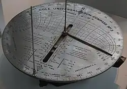 Burt's solar compass or astronomical compass/sun compass is a surveying instrument that makes use of the Sun's direction instead of magnetism. William Austin Burt invented his solar compass in 1835. The solar compass works on the principle that the direction to the Sun at a specified time can be calculated if the position of the observer on the surface of the Earth is known, to a similar precision. The direction can be described in terms of the angle of the Sun relative to the axis of rotation of the planet.