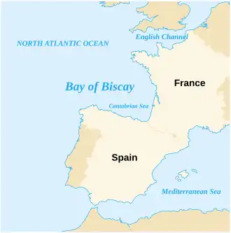 The Cantabrian Sea[a] is the term used mostly in Spain to describe the coastal sea of the Atlantic Ocean that borders the northern coast of Spain and the southwest side of the Atlantic coast of France, included in the Bay of Biscay. It extends from Cabo Ortegal in the province of A Coruña, to the mouth of the river Adour, near the city of Bayonne on the coast of the department of Pyrénées-Atlantiques in French Basque Country. The Cantabrian Sea contains the Avilés Canyons System.[1]