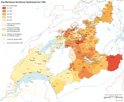 Charles III took advantage of the tumultuous situation in Geneva to attempt to conquer the city in 1535–36,[25] but coming to the aid of Geneva, a new army of Bernese in alliance with France defeated Savoy. It occupied the lands of Savoy in the Genevan basin (including all the Pays de Gex),[26] marking the end of the Duchy as a threat to Geneva and the recognition of Geneva's sovereignty. This was not without risk to Geneva, given how Bernese troops conquered Lausanne despite the cities' alliance.