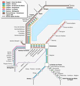 The Victor Emmanuel Railway showed interest in this link. Camillo Benso, prime minister of the Sardinian government, claimed that if the railways did not penetrate the Faucigny and Chablais, those territories "will be more detached from the rest of Savoy than Sardinia is from the rest of the continental provinces [of Italy]. Allowing this separation would be equivalent to abandoning those two good provinces to Switzerland".[42] However only a few kilometres of the line from Annecy would ever be built before the project was abandoned due to Savoy's annexation by France in 1860.[43] After the annexation, France prioritised the connection of its new provinces to the rest of the country with rail and quickly granted a concession to PLM to build a link between Fort l'Écluse on the Lyon-Geneva line to Annemasse and from there to Thonon-les-Bains and Faucigny.[44] This project was opposed by Geneva since the link would avoid crossing the canton. The Swiss government elaborated an alternative treaty in 1869 giving France five years to build the Annecy-Annemasse-Eaux-Vives-Geneva line, and tasking Switzerland with completing the Annemasse-Geneva section.[44] This would give Geneva a pivotal role in becoming the crossroads between Lyon, the Chablais, and Faucigny. Although initially the French government showed willingness to allow the construction of both options, the Franco-Prussian War put a stop to many projects, and only the Fort l'Écluse to Annemasse section would finally be completed.[42]