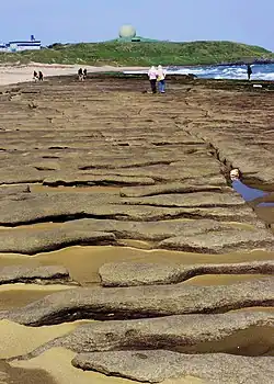 Cape Fugui or Fuguijiao Park surrounds the headland.[12] It includes a rocky beach with ventifacts (wind-shaped rocks)[12] and lush tropical vegetation.[1] There is a walking trail around the cape from Fuji Harbor (t 富基漁港, Fùjī Yúgǎng) to Laomei Village[12] and the brick Laomei Maze.[13][14] Old barracks from the Taiwanese armed forces have been converted into an arts center.[11] In September and October, the park forms part of Shimen District's kite festival.[12]