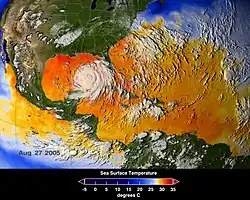 Average sea surface temperatures for the Caribbean Atlantic Ocean (25–27 August 2005).[25] Hurricane Katrina is seen just above Cuba.