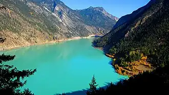 Carpenter Lake, officially Carpenter Lake Reservoir, is the largest of the three reservoirs of the Bridge River Power Project, which is located in the mountains west of Lillooet, British Columbia. The lake is about 185 kilometres north of the province's major city of Vancouver and is formed by the 1951 diversion of the Bridge River by Terzaghi Dam into Seton Lake via a tunnel through Mission Mountain, which separates the Seton and Bridge drainages. Several ranches and homesteads in the broad serpentine of the upper Bridge River basin were flooded out by the hydro project, which changed the character of the upper valley forever.