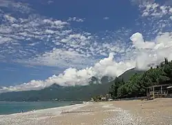 The Caucasian Riviera is a subtropical coastal zone along the eastern shores of the Black Sea under the Caucasus Mountains, with Krasnaya Polyana being the most known alpine ski resort.[1][2] Riviera runs from Novorossiysk, Russia to Sarpi, Georgia. The area is divided into five regions, of which four (Adjara, Guria, Samegrelo, and Abkhazia) are located in Georgia, and one (the Black Sea coast of Krasnodar Krai) is in Russia. The Caucasian Riviera is 600 km (370 mi) long, 350 km (220 mi) of which belongs to Russia and 250 km (160 mi) to Georgia.[3]
