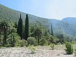 The mountain slopes are covered with rich woody vegetation - beech, hornbeam, chestnut, yew, fir and other conifers. On the coast south of Gelendzhik subtropical species of plants, in particular palms, yuccas, acacias, magnolias, boxwoods, prevail. Broad-leaved forests with lianas and evergreen shrubs are widespread in the south of the region. About six thousand plant species grow in the Black Sea coastal region, among which more than a hundred are found only in the Black Sea coast and a considerable number of relict plants, e.g. common laurel, Pontic rhododendron, Ilex colchica, Pistacia, Peperomia obtusifolia, Juniperus excelsa, Pinus brutia var. pityusa, and others.[18] The Anapa coast has the largest number of plant species in the region.